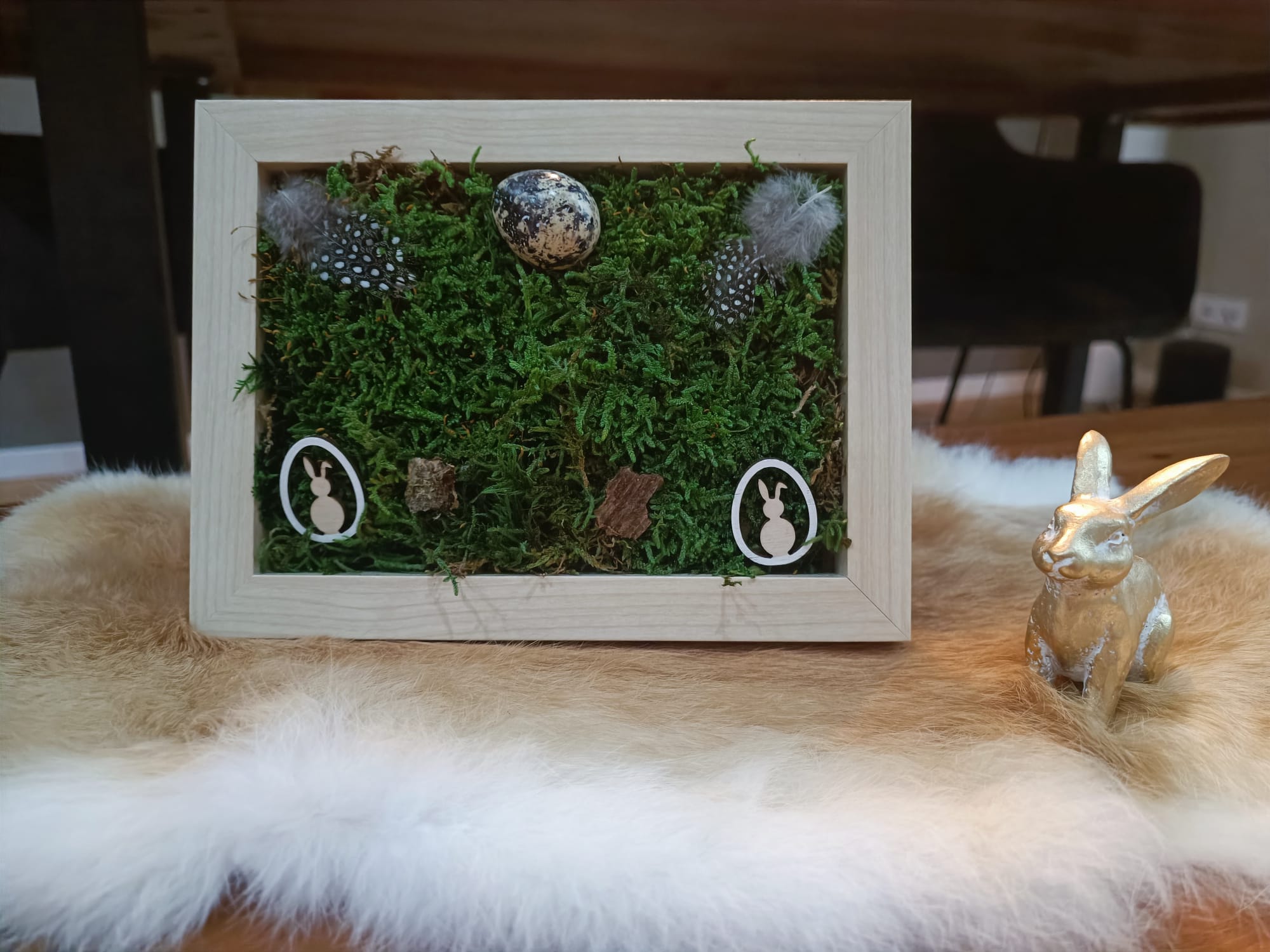 🌿 S’Frühjoars-Buidl: Hol dir den Lenz an die Wand! 🐰Wenn die ersten Sonnenstrahlen kitzeln und die Natur erwacht, wird es Zeit für ein Stück echtes Frühlingsglück in deinen vier Wänden. Unser „S’Frühjohrs-Buidl“ ist kein gewöhnliches Bild – es ist ein handgefertigtes Unikat, das die Frische des Waldes direkt in dein Wohnzimmer bringt.Was steckt in deinem Buidl?✨ Echtes Moos: Konserviertes, sattes Waldmoos, das dauerhaft grün bleibt – ganz ohne Gießen!🐇 Oster-Magie: Liebevoll gestaltete Hasenmotive, die neugierig aus dem Grün hervorlugen.🥚 Detailverliebt: Winzige Ostereier und zarte Federn setzen verspielte Akzente.🖼️ Handgemacht: Jedes Stück ist ein mit Herzblut gefertigtes Unikat im hochwertigen Rahmen.Warum du es lieben wirst:🌿 Natur pur: Bringt sofort Ruhe und Frische in jeden Raum.🚫 Null Pflege: Kein Wasser, kein Dünger, kein grüner Daumen nötig.🐣 Deko-Highlight: Der perfekte Blickfang für die Osterzeit (und darüber hinaus!).🎁 Geschenkidee: Ideal für alle, die das Besondere und Selbstgemachte lieben.Maße ca: 20,5 x 15,5 x 3 cm