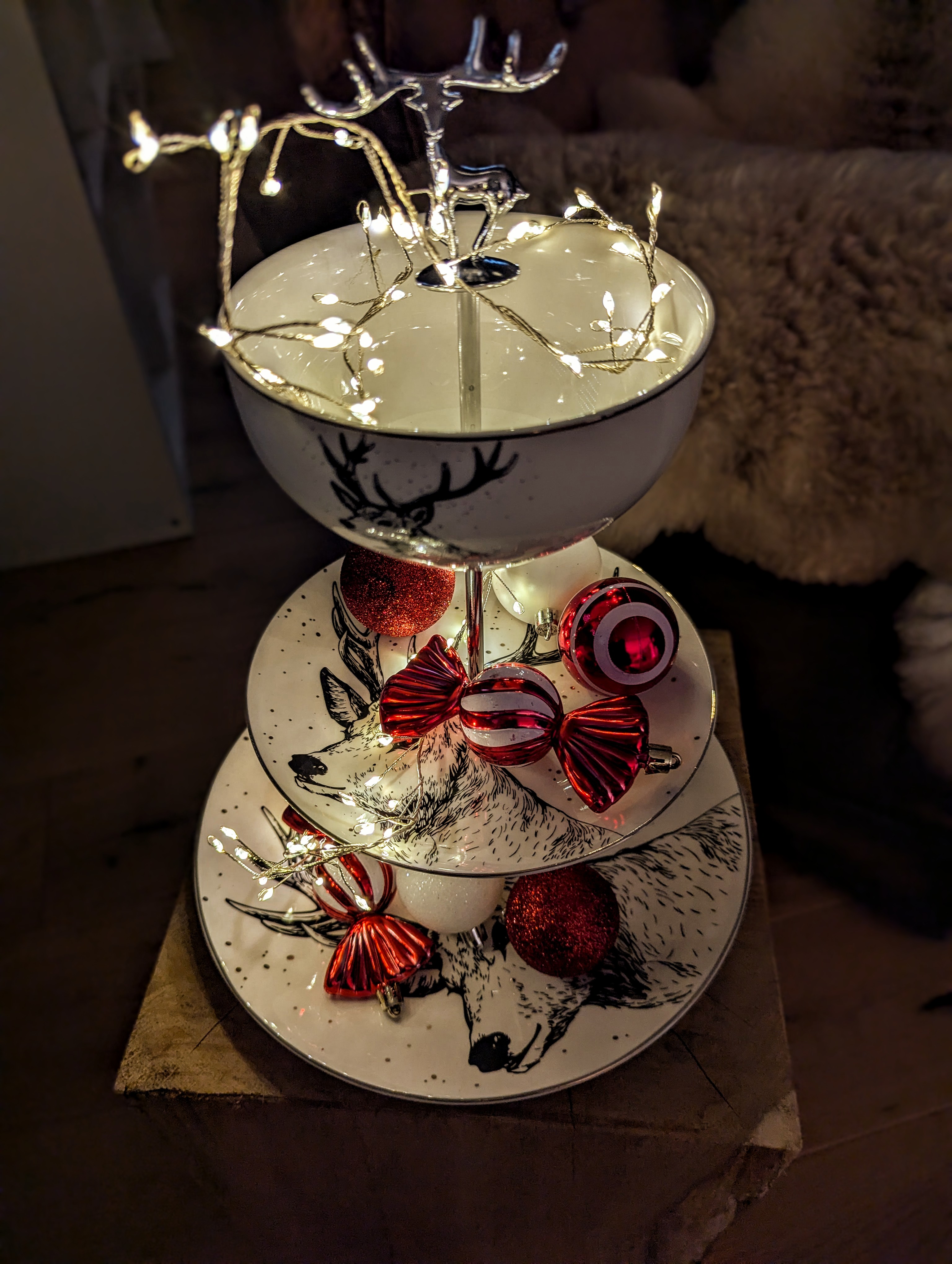 🦌 Selbstgemachte Etagèren aus Keramiktellern mit Hirschmotiv – Natürlich. Edel. Einzigartig. Diese handgemachten Etagèren aus Keramiktellern mit Hirschmotiv sind ein echtes Highlight für alle, die Natur, Handwerkskunst und stilvolles Design lieben. Jedes Stück wird mit viel Liebe gefertigt – aus ausgewählten Keramiktellern mit feinem Hirschdekor und einem kleinen Metallhirsch als Spitze, der der Etagère ihren unverwechselbaren Charakter verleiht. Die Kombination aus glatter Keramik, edlem Metall und dem charmanten Hirschdetail macht jede Etagère zu einem Unikat, das rustikale Gemütlichkeit und elegante Ästhetik vereint. Ob für festliche Anlässe, den winterlichen Kaffeetisch oder als stilvolle Deko im Chalet-Stil – diese Etagère bringt einen Hauch Alpenromantik in dein Zuhause. Perfekt zum Präsentieren von Gebäck, Pralinen oder kleinen Kostbarkeiten – oder einfach als liebevolles Geschenk mit Stil. ✨ Besondere Merkmale: Handgemacht mit Liebe zum Detail Edle Keramikteller mit Hirschmotiv – jedes Stück ein Unikat Krönender Abschluss: ein kleiner Metallhirsch als Spitze Ideal für festliche Tafeln, Winterdekoration & Alpen-Flair Stabil, dekorativ & mit natürlichem Charme 🕊️ Ein Hauch von Winterwald für dein Zuhause: Mit dieser selbstgemachten Etagère holst du dir den Zauber der Berge und den Charme handgemachter Kunst auf den Tisch – elegant, naturverbunden und einfach wunderschön.Die Dekoration ist nicht im Lieferumfang enthalten.