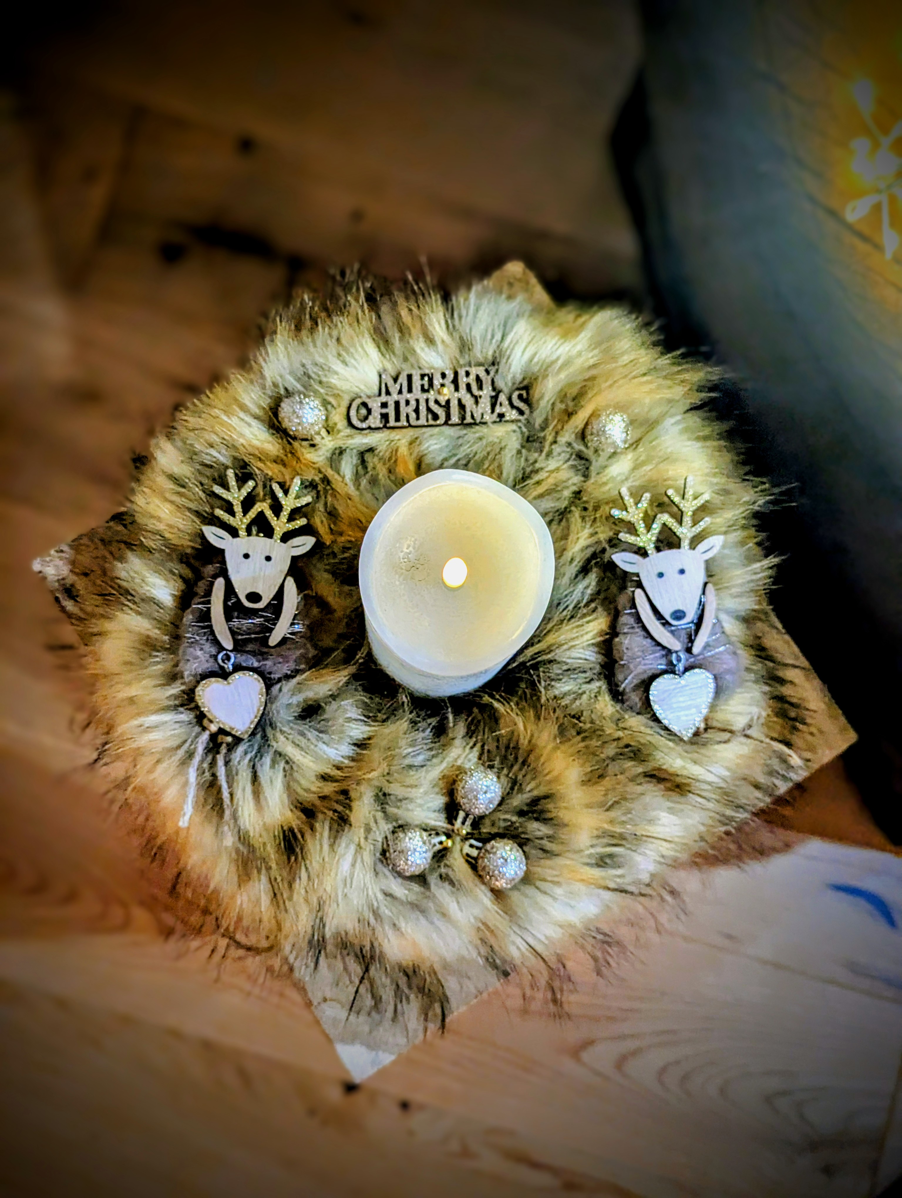 Ein Ring aus weichem, hochwertigem Kunstfell bildet die warme, winterliche Basis dieses einzigartigen Dekostücks. Perfekt für alle, die Natürlichkeit mit einem Hauch Luxus lieben.