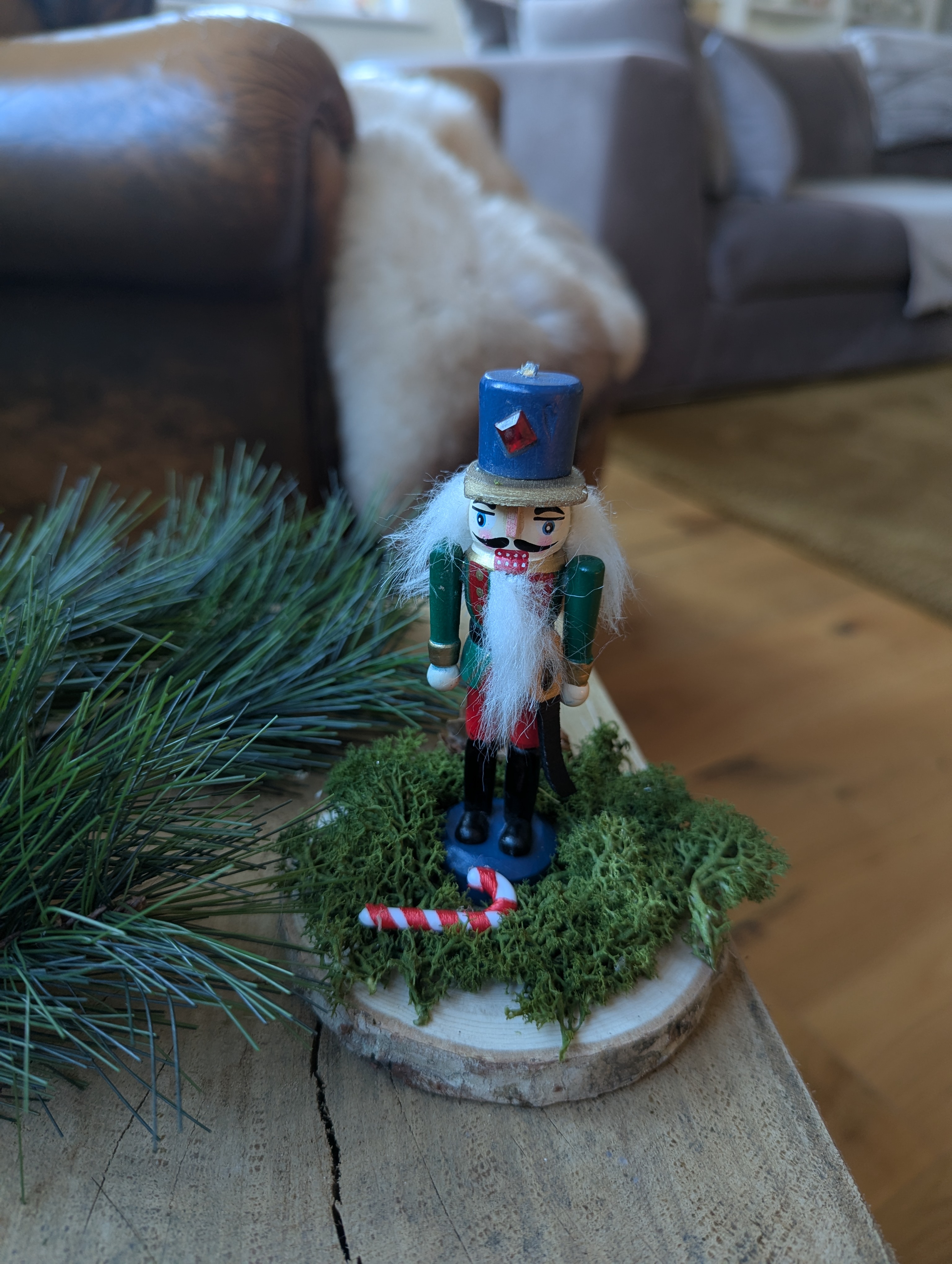 Handbemalter Holznussknacker auf moosbewachsener Baumscheibe – ein einzigartiges Deko-Highlight Dieser liebevoll handbemalte Holznussknacker ist ein besonderes Schmuckstück für jede weihnachtliche Dekoration. In den klassischen Festfarben Grün, Rot und Blau gestaltet, bringt er traditionellen Charme und festliche Eleganz in dein Zuhause. Ein besonderes Detail ist sein Standfuß: Der Nussknacker steht auf einer natürlichen Baumscheibe aus Holz, die mit echtaussehendem Moos verziert ist. Dadurch erhält das Arrangement eine warme, naturverbundene Ausstrahlung – perfekt für gemütliche Winter- und Weihnachtsdekorationen. Ob als Blickfang auf dem Sideboard, Mittelpunkt eines weihnachtlichen Arrangements oder als Geschenk für Liebhaber traditioneller Handwerkskunst: Dieser Holznussknacker verleiht jedem Raum eine besondere, festliche Note. Ein echtes Unikat – charmant, hochwertig und voller Weihnachtsmagie.Zum Verkauf steht lediglich der Holznussknacker auf der Baumscheibe inkl. der darauf befindlichen Dekoration. Alle weiteren Artikel auf den Produktfotos stellen nur einen Gestaltungsvorschlag dar.